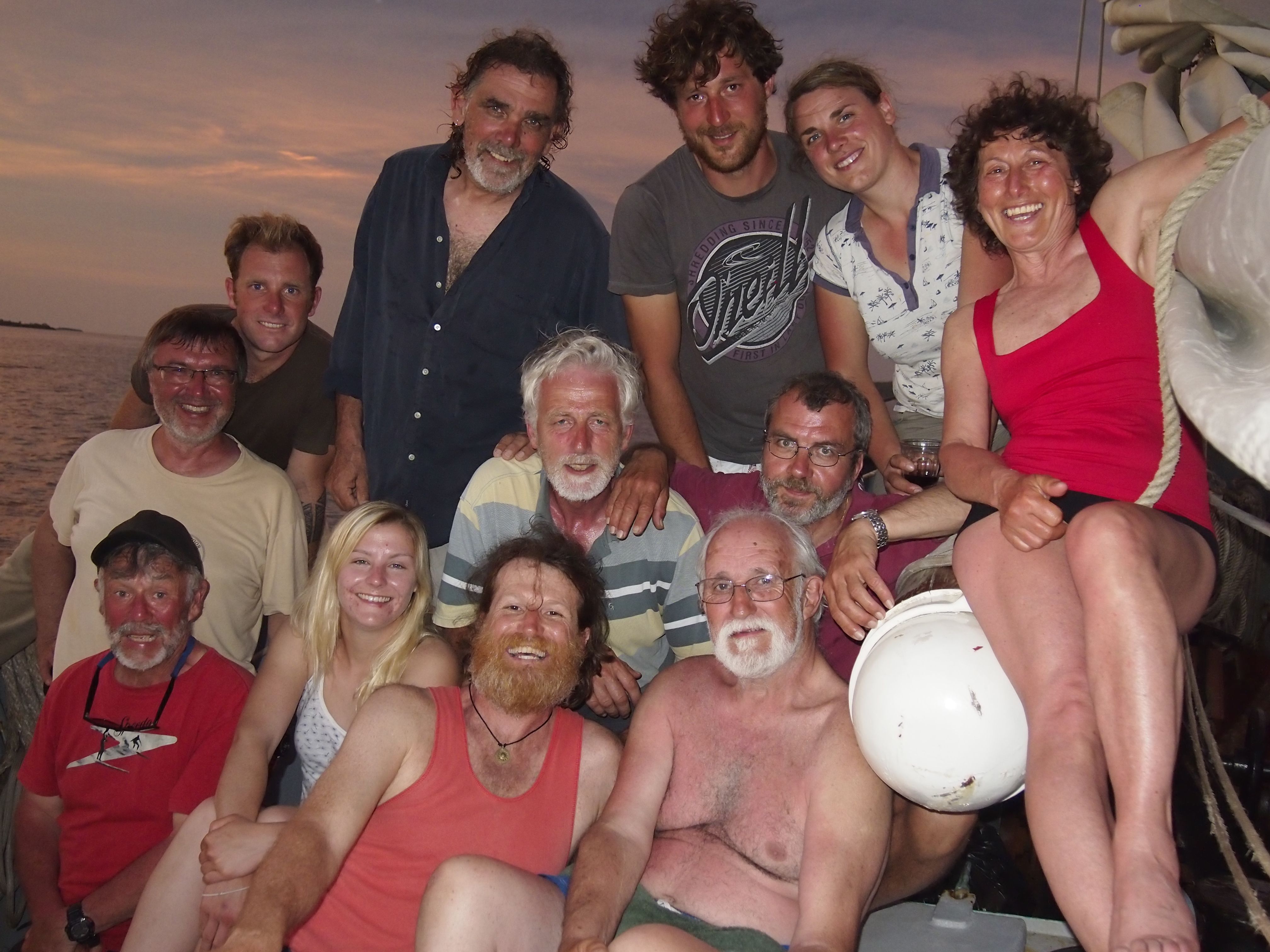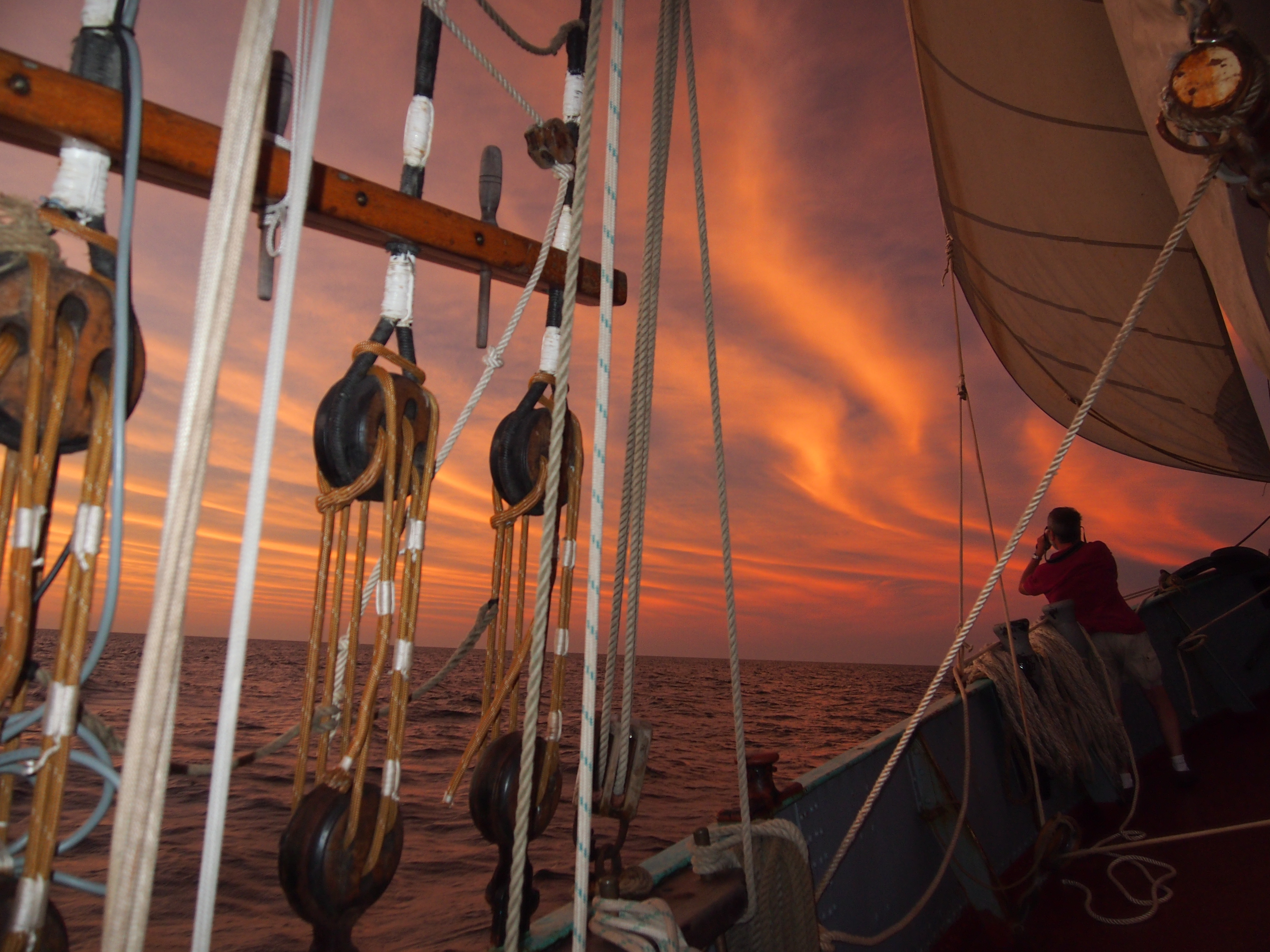 Christmas Eve came and went while on watch on a steady calm ocean, still cool enough to keep most of one’s layers on while up on deck. And the colours in the evening sky were a perfect accompaniment to dream of the peace we all wish for at this time of the year. On Christmas Day we all gathered for a Christmas Dinner of the Crew and taking advantage of a moment on the high seas to let down our collective hair we all got a bit tipsy. Captain Gijs took control of the helm with his father Jan, allowing the rest of us a moment to cease our duties.