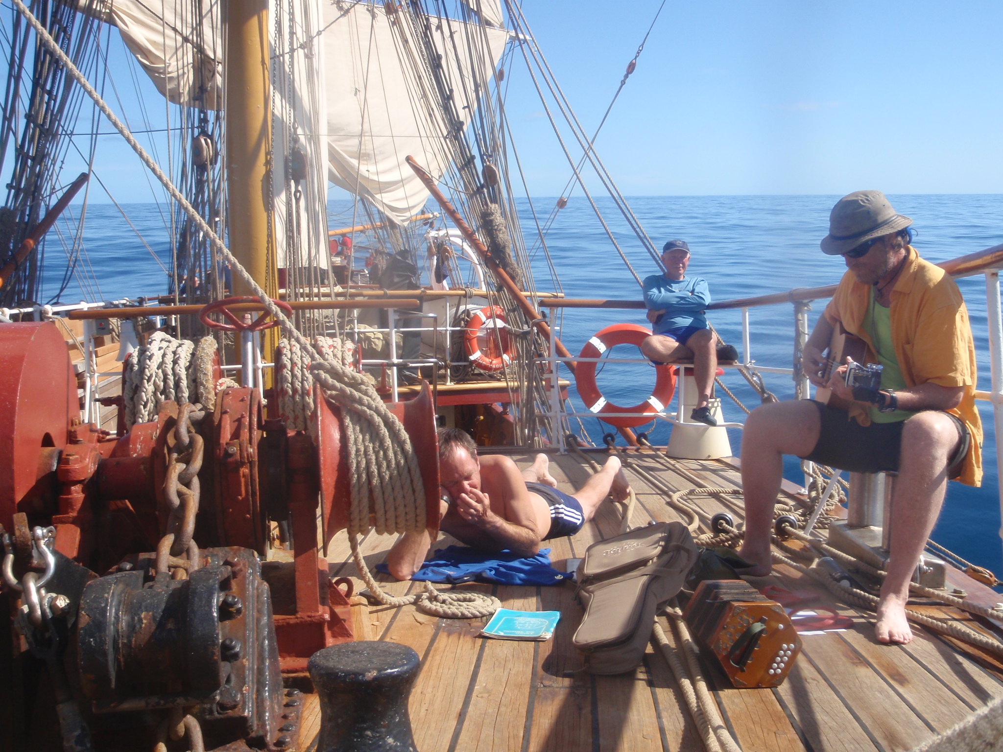 ‘Alles wel’, as the Dutch say. Only one major injury – a knife cut to Kiwi Mike’s left hand who was doing some rope maintenance work, and which the ship’s doctor Leen helped along with five a quick five stitches.